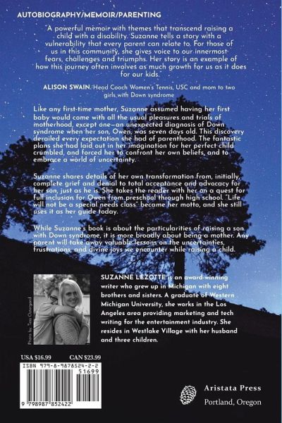 Raising Owen: An Extra-ordinary Memoir of Motherhood is the story of a first time mother coming to terms with her oldest son's surprise diagnosis of Down syndrome shortly after his birth. Like any first time mother, Suzanne Lezotte assumed having her first baby would come with all the usual pleasures and trials of motherhood, except one-an unexpected diagnosis of Down syndrome when her son Owen was seven days old. Her every expectation of parenthood was derailed. The fantastic plans she had laid out in her imagination for her perfect child crumbled, and forced her to confront her own beliefs, and to embrace a world of uncertainty. Suzanne shares details of her own transformation from initial complete grief and denial to total acceptance and advocacy for her son, just as he is. She takes the reader on a quest for full inclusion for Owen from preschool through high school. "Life will not be a special needs class" became her motto and she still uses it as her guide today. While Suzanne's book is about the particularities of raising a son with Down syndrome, it is more broadly about being a mother and the valuable lessons we encounter when raising a child.