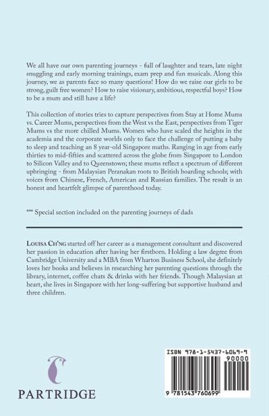 We all have our own parenting journeys - full of laughter and tears, late night snuggling and early morning trainings, exam prep and fun musicals. Along this journey, we as parents face so many questions! How do we raise our girls to be strong, guilt free women? How to raise visionary, ambitious, respectful boys? How to be a mum and still have a life? This collection of stories tries to capture perspectives from Stay at Home Mums vs. Career Mums, perspectives from the West vs the East, perspectives from Tiger Mums vs the more chilled Mums. Women who have scaled the heights in the academia and the corporate worlds only to face the challenge of putting a baby to sleep and teaching an 8 year-old Singapore maths. Ranging in age from early thirties to mid-fifties and scattered across the globe from Singapore to London to Silicon Valley and to Queenstown; these mums reflect a spectrum of different upbringing - from Malaysian Peranakan roots to British boarding schools; with voices from Chinese, French, American and Russian families. The result is an honest and heartfelt glimpse of parenthood today. *** Special section included on the parenting journeys of dads