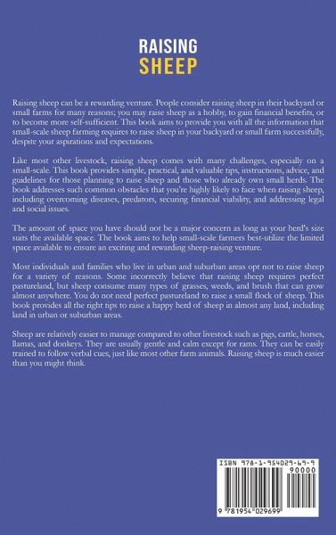 If you've always wanted to raise sheep in your backyard or small farm but don't have the expertise, then keep reading... Have you read about raising sheep before, but nothing seems to offer enough information for you to complete this task successfully? Do you finally want to say goodbye to your thoughts about failure and discover something that works for you? If so, then you've come to the right place. Raising sheep need not be difficult, even if you have tried it in the past without success. The number of small-scale sheep farmers in the U.S. is on the rise. Many small-scale sheep farmers raise not only healthy sheep but also make a steady income by selling sheep products. Here's just a fraction of what you'll discover in this book:Get to know the real facts about sheep and raising them in backyards and small farms. Familiarize yourself with the various sheep breeds and their purposes. How to identify the differences between raising sheep in backyards vs. small farms. Learn about sheep housing methods and fencing. Enlighten yourself about the nutritional needs of sheep and how to feed them. Master the art of guarding sheep. Understand sheep shearing, care, and maintenance. Discover all you need to know about sheep reproduction. Get to know the lambing process to guarantee increased lambing rates. Learn how to keep your sheep healthy. Discover various ways you can sell sheep products to different markets. Learn how to show sheep and be great at it. And much, much more! Imagine how you'll feel when raising a healthy and happy flock of sheep and when your sheep-raising venture becomes successful, bringing you extra income. Even if you're new to raising sheep or have tried it before without success, you can still succeed by reading this book! If you've always dreamed of becoming a successful small-scale sheep farmer or raising sheep in your backyard, then scroll up and click the "add to cart" button!