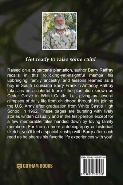 Raised on a sugarcane plantation, author Barry Raffray recalls in this rollicking-yet-insightful memoir his upbringing, family ancestry, and lessons leamed as a boy in South Louisiana Barry Franklin Anthony Raffray takes us on a colorful tour of the plantation known as Cedar Grove in White Castle, La., giving us several glimpses of daily life from childhood through his joining the U.S. Army after graduation from White Castle High School in 1962. These pages are bursting with lively stories written casually and in the first-person except for a few memorable tales handed down by loving family members. Far from a mere autobiography or historical sketch, you'll feel a special kinship with Barry after each read as he shares his favorite life experiences with you!