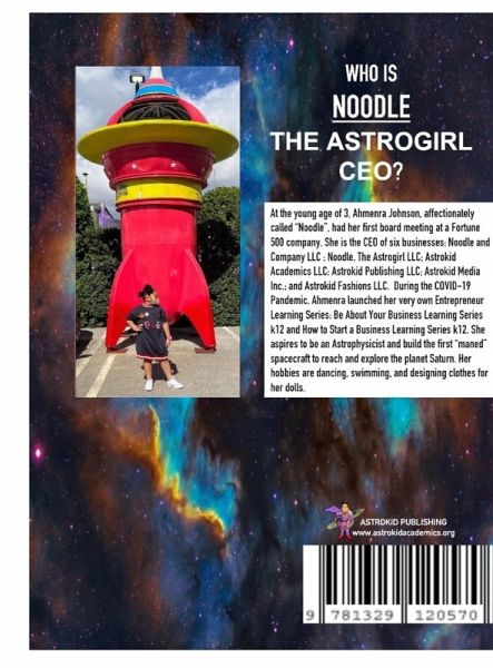 At the young age of 3, Ahmenra Johnson, affectionately called "Noodle", had her first board meeting at a Fortune 500 company. She is the CEO of six businesses: Noodle and Company LLC ; Noodle, The Astrogirl LLC; Astrokid Academics LLC; Astrokid Publishing LLC; Astrokid Media Inc.; and Astrokid Fashions LLC. During the pandemic, Ahmenra launched her very own Entrepreneur Learning Series: Be About Your Business Learning Series k12 and How to Start a Business Learning Series k12. She aspires to be an Astrophysicist and build the first "maned" spacecraft to reach and explore the planet Saturn. Her hobbies are dancing, swimming, and designing clothes for her dolls.