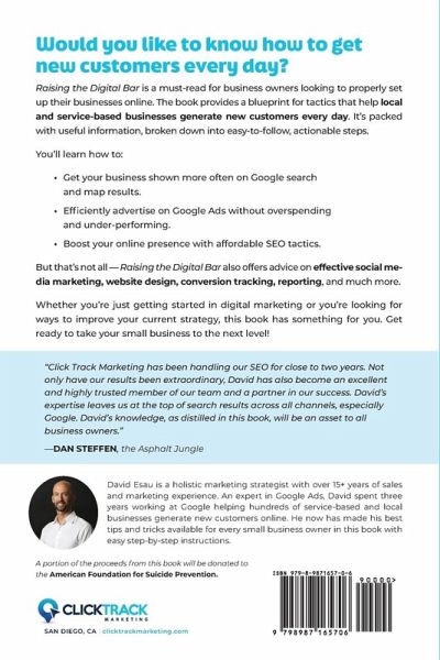 Would you like to know how to get new customers every day? Raising the Digital Bar is a must-read for business owners looking to properly set up their businesses online. The book provides a blueprint for tactics that help local and service-based businesses generate new customers every day. It's packed with useful information, broken down into easy-to-follow, actionable steps. You'll learn how to: Get your business shown more often on Google search and map results. Efficiently advertise on Google Ads without overspending and under-performing. Boost your online presence with affordable SEO tactics. But that's not all - Raising the Digital Bar also offers advice on effective social media marketing, website design, conversion tracking, reporting, and much more. Whether you're just getting started in digital marketing or you're looking for ways to improve your current strategy, this book has something for you. Get ready to take your small business to the next level in 2023!