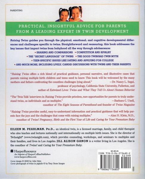 Raising Twins guides you through the physical, emotional, and cognitive developmental differences and challenges specific to twins. Straightforward and reassuring, this book addresses the key issues that impact twins from babyhood all the way through adolescence: Sharing and comparisons Competition and rivalry The "secret language" of twins The good twin/bad twin myth Teen-specific issues like dating and applying for college And much more including lively, candid discussions with twins and their parents