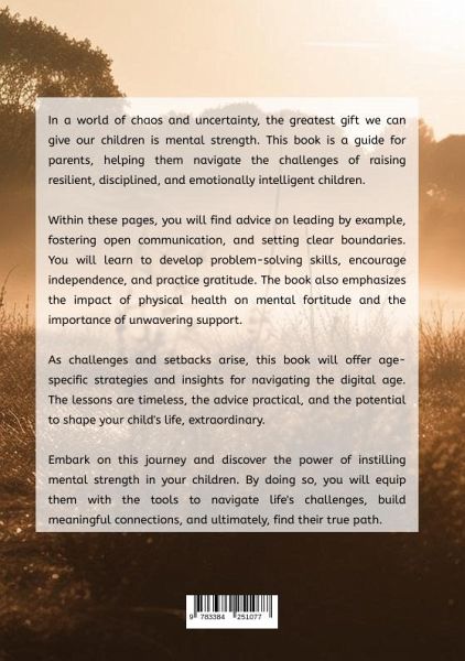 In a world of chaos and uncertainty, the greatest gift we can give our children is mental strength. This book is a guide for parents, helping them navigate the challenges of raising resilient, disciplined, and emotionally intelligent children.Within these pages, you will find advice on leading by example, fostering open communication, and setting clear boundaries. You will learn to develop problem-solving skills, encourage independence, and practice gratitude. The book also emphasizes the impact of physical health on mental fortitude and the importance of unwavering support.As challenges and setbacks arise, this book will offer age-specific strategies and insights for navigating the digital age. The lessons are timeless, the advice practical, and the potential to shape your child's life, extraordinary.Embark on this journey and discover the power of instilling mental strength in your children. By doing so, you will equip them with the tools to navigate life's challenges, build meaningful connections, and ultimately, find their true path.