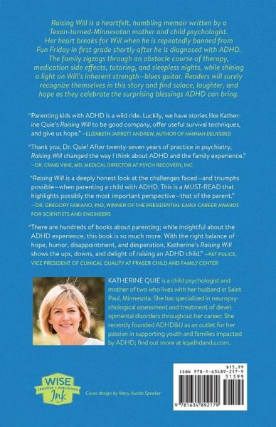 "This memoir is the real deal. Read it. Laugh, cry, learn, fly, and discover the superpower embedded in the condition so misleadingly and inaccurately called ADHD." —Dr. Edward Hallowell, national ADHD expert and New York Times bestselling author Raising Will is a heartfelt, humbling memoir written by a Texan-turned-Minnesotan mother and child psychologist. Her heart breaks for Will when he is repeatedly banned from Fun Friday in first grade shortly after he is diagnosed with ADHD. The family zigzags through an obstacle course of therapy, medication side effects, tutoring, and sleepless nights, while shining a light on Will’s inherent strength—blues guitar. Readers will surely recognize themselves in this story and find solace, laughter, and hope as they celebrate the surprising blessings ADHD can bring.