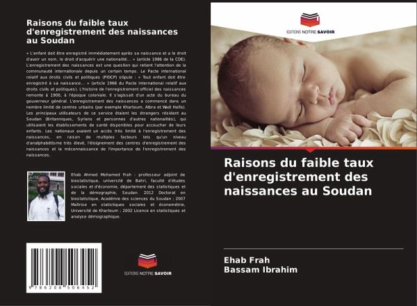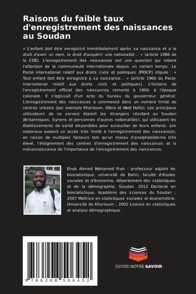 « L'enfant doit être enregistré immédiatement après sa naissance et a le droit d'avoir un nom, le droit d'acquérir une nationalité... » (article 1986 de la CDE). L'enregistrement des naissances est une question qui retient l'attention de la communauté internationale depuis un certain temps. Le Pacte international relatif aux droits civils et politiques (PIDCP) stipule : « Tout enfant doit être enregistré à sa naissance... » (article 1966 du Pacte international relatif aux droits civils et politiques). L'histoire de l'enregistrement officiel des naissances remonte à 1900, à l'époque coloniale. Il s'agissait d'un acte du bureau du gouverneur général. L'enregistrement des naissances a commencé dans un nombre limité de centres urbains (par exemple Khartoum, Atbra et Wadi Halfa). Les principaux utilisateurs de ce service étaient les étrangers résidant au Soudan (Britanniques, Syriens et personnes d'autres nationalités), qui utilisaient les établissements de santé disponibles pour accoucher de leurs enfants. Les nationaux avaient un accès très limité à l'enregistrement des naissances, en raison de multiples facteurs tels qu'un niveau d'analphabétisme très élevé, l'éloignement des centres d'enregistrement des naissances et la méconnaissance de l'importance de l'enregistrement des naissances.