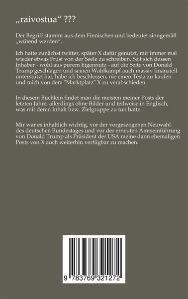 "Raivostua" stammt aus dem Finnischen und bedeutet "wütend werden". Meist schrieb ich Kurznachrichten bei Twitter / X, aber nun möchte ich mich von dieser Online-Plattform verabschieden und habe deshalb meine Post aus der digitalen Welt in das analoge Medium Buch verschoben.