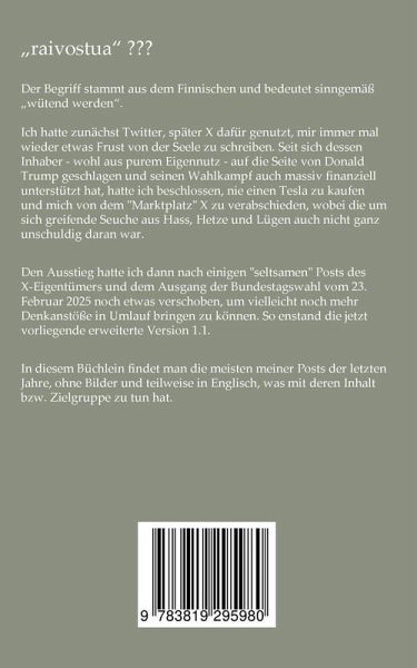 "Raivostua" bedeutet "wütend werden. In dem Buch findet man die analogisierten Posts, die ursprünglich auf Twitter / X zu finden waren. Die Veränderung der Stimmung nach dem Besitzerwechsel und die zunehmende Verbreitung von Hass, Hetze und Lügen gab letztendlich den Anlass zu diesem Buch und dem Abschied von der Online-Plattform. Die meisten Posts beschäftigen sich mit ihren maximal 280 Zeichen mit Politischem in Deutschland und den USA. Der Angriffskrieg Russlands gegen die Ukraine und Mobilität waren weitere Schwerpunkte der Kurznachrichten, die ihren Weg in dieses Buch gefunden haben.