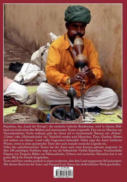 Rajasthan, das "Land der Könige", der exotische indische Bundesstaat, wird in diesem Bildband mit eindrucksvollen Bildern und interessanten Texten vorgestellt. Fast wie ein Märchen aus Tausendundeiner Nacht wirkend, geht der Autor auf so faszinierende Themen wie "Paläste", "Götter" oder "Maharadschahs" ein. Natürlich werden auch Menschen, Tiere, Glauben, Hütten und anderes aus diesem Land voller Gegensätze behandelt. Dabei zeigt der Autor fundiertes Wissen, streut in seine spannenden Texte aber auch manche exotische Legende ein.Nebst den aufschlussreichen Texten hat der Autor auch seine Kamera gekonnt eingesetzt. In über 230 prächtigen Farbfotos zeigt er uns die farbenfrohe Vielfalt Rajasthans. Verschnörkelte Eleganz von Tempeln, Bilder von Maharadshahs, Göttern und exotischen Menschen hat er mit gutem Blick für Details festgehalten.Texte und Fotos werden grafisch in einem modernen, aber dem Land angepassten Stil präsentiert.Mit diesem Buch hat der Autor und Fotograf Lutz Simon ein eindrückliches Werk geschaffen.