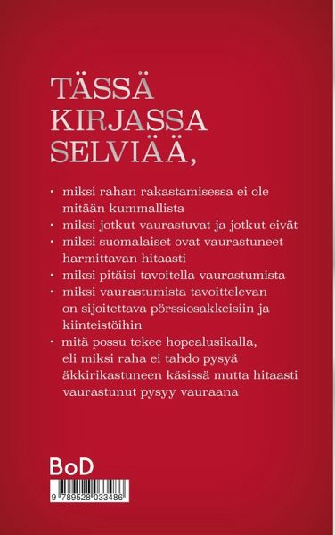 Tässä kirjassa selviää, · miksi rahan rakastamisessa ei ole mitään kummallista · miksi jotkut vaurastuvat ja jotkut eivät · miksi suomalaiset ovat vaurastuneet harmittavan hitaasti · miksi pitäisi tavoitella vaurastumista · miksi vaurastumista tavoittelevan on sijoitettava pörssiosakkeisiin ja kiinteistöihin · mitä possu tekee hopealusikalla, eli miksi raha ei tahdo pysyä äkkirikastuneen käsissä mutta hitaasti vaurastunut pysyy vauraana