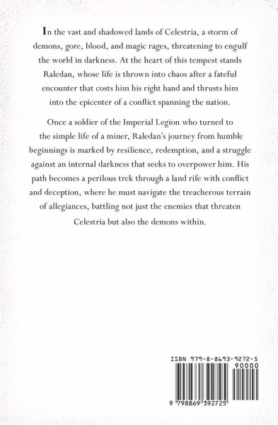 In the vast and shadowed lands of Celestria, a storm of demons, gore, blood, and magic rages, threatening to engulf the world in darkness. At the heart of this tempest stands Raledan, whose life is thrown into chaos after a fateful encounter that costs him his right hand and thrusts him into the epicenter of a conflict spanning the nation. Once a soldier of the Imperial Legion who turned to the simple life of a miner, Raledan's journey from humble beginnings is marked by resilience, redemption, and a struggle against an internal darkness that seeks to overpower him. His path becomes a perilous trek through a land rife with conflict and deception, where he must navigate the treacherous terrain of allegiances, battling not just the enemies that threaten Celestria but also the demons within.