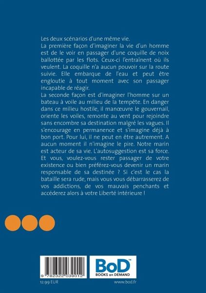 Deux scénarios pour une même vie.La première façon d'imaginer la vie d'un homme est de le voir en passager d'une coquille de noix ballottée par les flots. Ceux-ci l'entraînent où ils veulent. La coquille n'a aucun pouvoir sur la route suivie. Elle embarque de l'eau et peut être engloutie à tout moment avec son passager incapable de réagir.La seconde façon est d'imaginer l'homme sur un bateau à voile au milieu de la tempête. En danger dans ce milieu hostile, il manoeuvre le gouvernail, oriente les voiles, remonte au vent pour rejoindre sans encombre sa destination malgré les vagues. Il s'encourage en permanence et s'imagine déjà à bon port. Pour lui, il ne peut en être autrement. A aucun moment il n'imagine le pire. Notre marin est acteur de sa vie. L'autosuggestion est sa force. Et vous, voulez-vous rester passager de votre existence ou bien préférez-vous devenir un marin responsable de sa destinée ? Si c'est le cas la bataille sera rude, mais vous vous débarrasserez de vos addictions, de vos mauvais penchants et accéderez alors à votre Liberté intérieure !