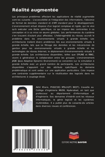 Les principaux problèmes affectant les applications de réalité augmentée sont les suivants : L'accessibilité et l'intégration des informations, l'absence de format de données standard et d'API standard pour le développement. L'environnement virtuel dispose d'un logiciel complexe et rigide, qui ne vise qu'à exécuter une tâche spécifique, ce qui impose des contraintes à sa conception et à sa mise en oeuvre globales. Les performances du système s'en trouvent d'autant plus affectées. L'hétérogénéité du réseau accroît le problème dans les environnements virtuels à grande échelle. Les architectures traitent divers problèmes liés aux environnements virtuels à grande échelle, tels que Le filtrage des données et les mécanismes de gestion pour les environnements virtuels à grande échelle et les technologies de réseau Internet, le déploiement d'environnements virtuels à grande échelle. Les architectures disponibles, telles que SPLINE et RING, visent à généraliser la collaboration entre les groupes. L'environnement JADE (Java Adaptive Dynamic Environment) se concentre sur la simulation à grande échelle avec un grand nombre de participants. Les architectures disponibles s'appuient sur des attributs spécifiques du domaine problématique et sont axées sur une application particulière. Cela impose une contrainte supplémentaire sur la réutilisation des logiciels dans les architectures à couplage étroit.