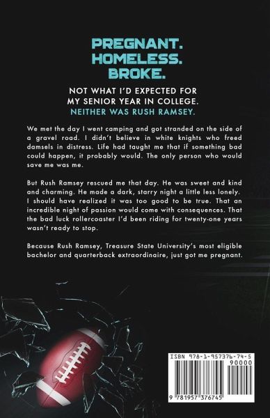 Pregnant. Homeless. Broke. Not what I'd expected for my senior year in college. Neither was Rush Ramsey. We met the day I went camping and got stranded on the side of a gravel road. I didn't believe in white knights who freed damsels in distress. Life had taught me that if something bad could happen, it probably would. The only person who would save me was me. But Rush Ramsey rescued me that day. He was sweet and kind and charming. He made a dark, starry night a little less lonely. I should have realized it was too good to be true. That an incredible night of passion would come with consequences. That the bad luck rollercoaster I'd been riding for twenty-one years wasn't ready to stop. Because Rush Ramsey, Treasure State University's most eligible bachelor and quarterback extraordinaire, just got me pregnant.