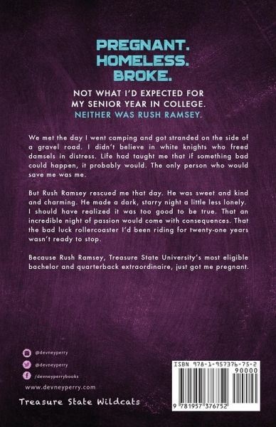 Pregnant. Homeless. Broke. Not what I'd expected for my senior year in college. Neither was Rush Ramsey. We met the day I went camping and got stranded on the side of a gravel road. I didn't believe in white knights who freed damsels in distress. Life had taught me that if something bad could happen, it probably would. The only person who would save me was me. But Rush Ramsey rescued me that day. He was sweet and kind and charming. He made a dark, starry night a little less lonely. I should have realized it was too good to be true. That an incredible night of passion would come with consequences. That the bad luck rollercoaster I'd been riding for twenty-one years wasn't ready to stop. Because Rush Ramsey, Treasure State University's most eligible bachelor and quarterback extraordinaire, just got me pregnant.