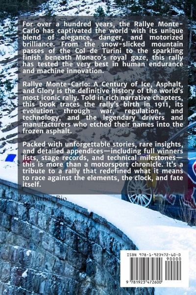 For over a hundred years, the Rallye Monte-Carlo has captivated the world with its unique blend of elegance, danger, and motorized brilliance. From the snow-slicked mountain passes of the Col de Turini to the sparkling finish beneath Monaco's royal gaze, this rally has tested the very best in human endurance and machine innovation. Rallye Monte-Carlo: A Century of Ice, Asphalt, and Glory is the definitive history of the world's most iconic rally. Told in rich narrative chapters, this book traces the rally's birth in 1911, its evolution through war, regulation, and technology, and the legendary drivers and manufacturers who etched their names into the frozen asphalt. Packed with unforgettable stories, rare insights, and detailed appendices-including full winners lists, stage records, and technical milestones-this is more than a motorsport chronicle. It's a tribute to a rally that redefined what it means to race against the elements, the clock, and fate itself.