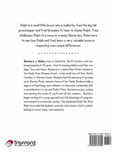 Barbara J. Malloy lives in Charlotte, North Carolina with her loving husband of 26 years, their 4 amazing children and their two dogs; Tyco and Haseo. Barbara is a native New Yorker reared on the family farm (Downey Farm), in the small town of Oine, North Carolina, in Warren County. Barbara had the pleasure of growing up on Downey Road, named in honor of her family. Barbara holds a degree in Psychology and a Master's in Education Leadership with a specialization in Law and Public Policy. Barbara enjoys writing and opening the minds of youth and all her readers. Barbara began writing at a young age and took full advantage of using her environment to create her stories. She developed Ralph the Wind Rider to provide the students, parents, and schools a tool to combat bullying in school, home, and community.