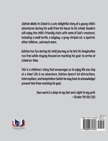 Ralston Walks to School is a cute, delightful story of a young child's adventures during his walk from his house to his school. Readers will enjoy the child's friendly chats with some of God's creatures, including a small turtle, a ladybug, a gray-striped cat, a squirrel, other children...and much more. Ralston has fun during his vivid journey as he lets his imagination run free while staying focused on reaching his goal: to arrive at school on-time. This is a children's story that encourages us to enjoy life one step at a time! Life is an adventure. Ralston doesn't let distractions, interruptions, and temptations (which he may have to acknowledge) prevent him from reaching his goal. Your word is a lamp to my feet and a light to my path. (Psalm 119:105 ESV)