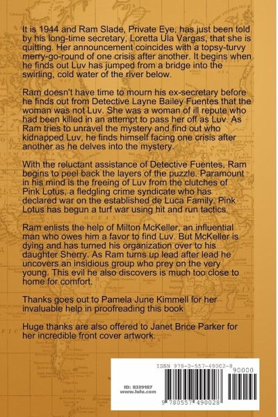 Ram Slade, Shamus is set in the year 1944 and centers on Ram's secretary, Luv, who quits working for him after five years. Her faked suicide and eventual disappearance has Ram chasing into the strange happenings. He follows leads where nothing it's supposed to be and no one's who they are supposed to be. Layne Fuentes, a homicide detective is also looking for Luv. Everything that makes a hard-boiled detective story workable is in Ram Slade, Shamus. Beautiful women, gun molls, street weasels and hoods of all kind. Each layer of evidence Ram uncovers only leads to more mystery and confusion. Bea, his new secretary makes for more turmoil within Ram's thoughts, plus Mandy, a gangster's wife who wants him to hide her from her husband. In desperation Ram turns to an influential ex-client of his who owes him a favor to find Luv. A page turner is Ram Slade, Shamus . . .