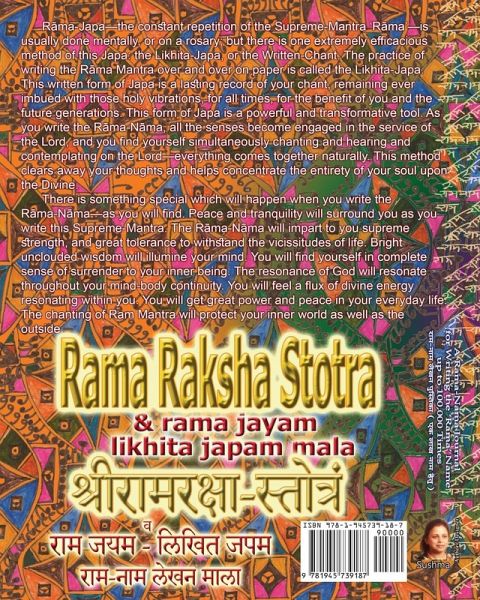 This Journal contains outline of Hindu Sacred Text Rama-Raksha-Stotram (Hymn to gain Protection of Lord-God Rama) around which Rama Name can be written. Also Transliteration & Translation of Rama-Raksha-Stotram Verses is provided on pages.The full text is also repeated at the end with Translation. A grid of 21 by 48 (1008 boxes) is provided for the user to be able to write a thousand Rama Names per page. With 108 pages to write upon, and with space for 1008 names per page, users can write the 100,000 Rama Names in this Journal. Rama-Japa—the constant repetition of the Supreme Mantra Rama—is usually done mentally, or on a rosary; but there is one extremely efficacious method of this Japa: the Likhita-Japa. The practice of writing the Rama Mantra over and over on paper is called the Likhita-Japa. This is a Journal for the Likhita Rama-Nama Japa, or the Written-Chant of the Hindu God Rama. The written form of Japa is a lasting record of chant, remaining ever imbued with those holy vibrations, for all times, for the benefit of writer and the future generations. Once embellished with your Rama-Namas, this Rama-Raksha-Stotram book will become a priceless treasure which you can gift to your loved ones—an unparalleled gift of love, labor, caring, wishing, and above all——Devotion.