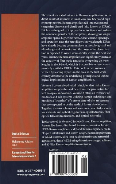 There has been a revived interest in Raman amplification due to the availability of high pump powers and improvements in small core size fibers. Two general categories of Raman amplifiers exist: distributed and discrete, also known as DRAs. They improve the noise figure and reduce the nonlinear penalty of the amplifier, allowing for longer amplifiers spans, higher bit rates, closer channel spacings, and operation near the zero dispersion wavelength. DRAs are already becoming commonplace in most long-haul networks. Consequently, Raman amplifiers should see a wide range of deployment in the next few years. This edited monograph is written by leading experts in this area and is the first book entirely devoted to Raman amplification. Three sections include extensive background on Raman physics, descriptions of sub-systems and modules utilizing Raman technology, and a review of current state-of-the-art systems. Technologies presented include applications for long-haul and ultra-long-haul submarine, terrestrial, soliton, and high-speed systems. This book will be a resource for scientists and optical engineers in optoelectronics, fiber optics, telecommunication, and optical networks.