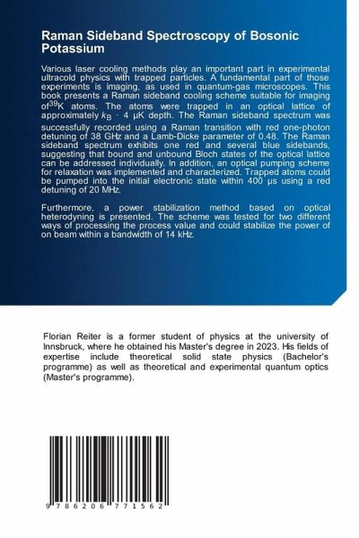 Various laser cooling methods play an important part in experimental ultracold physics with trapped particles. A fundamental part of those experiments is imaging, as used in quantum-gas microscopes. This book presents a Raman sideband cooling scheme suitable for imaging of39K atoms. The atoms were trapped in an optical lattice of approximately kB · 4 miK depth. The Raman sideband spectrum was successfully recorded using a Raman transition with red one-photon detuning of 38 GHz and a Lamb-Dicke parameter of 0.48. The Raman sideband spectrum exhibits one red and several blue sidebands, suggesting that bound and unbound Bloch states of the optical lattice can be addressed individually. In addition, an optical pumping scheme for relaxation was implemented and characterized. Trapped atoms could be pumped into the initial electronic state within 400 mis using a red detuning of 20 MHz.Furthermore, a power stabilization method based on optical heterodyning is presented. The scheme was tested for two different ways of processing the process value and could stabilize the power of on beam within a bandwidth of 14 kHz.