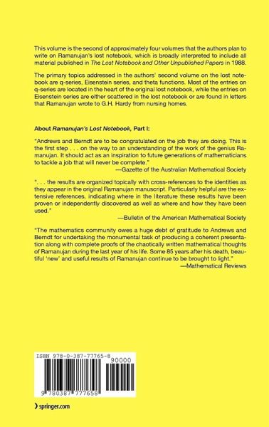 "This volume contains 16 chapters comprising 314 entries. The material is arranged thematically with the main topics being some of Ramanujan's favorites q series theta functions ... . the authors treatment is extremely thorough. Each chapter contains an introduction with appropriate background. References to all other known proofs of the entries are provided. ... Fans of Ramanujan's mathematics are sure to be delighted by this book. ... Many entries are just begging for further study and will undoubtedly be inspiring research for decades to come." (Jeremy Lovejoy, Mathematical Reviews, Issue 2010 f)