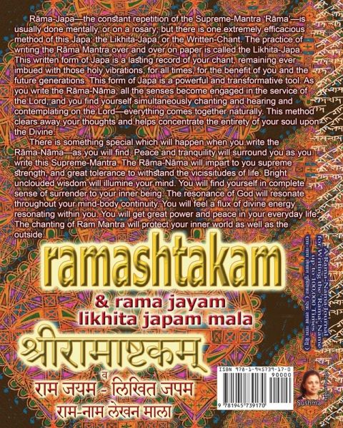 This Journal contains outline of Ramashtakam (8 verses on Rama) around which Rama Name can be written. Also Transliteration & Translation of Ramashtakam Verses is provided on pages.The full text is also repeated at the end with Translation. A grid of 21 by 48 (1008 boxes) is provided for the user to be able to write a thousand Rama Names per page. With 108 pages to write upon, and with space for 1008 names per page, users can write the 100,000 Rama Names in this Journal. Rama-Japa—the constant repetition of the Supreme Mantra Rama—is usually done mentally, or on a rosary; but there is one extremely efficacious method of this Japa: the Likhita-Japa. The practice of writing the Rama Mantra over and over on paper is called the Likhita-Japa. This is a Journal for the Likhita Rama-Nama Japa, or the Written-Chant of the Hindu God Rama. The written form of Japa is a lasting record of chant, remaining ever imbued with those holy vibrations, for all times, for the benefit of writer and the future generations. Once embellished with your Rama-Namas, this Ramashtakam will become a priceless treasure which you can gift to your loved ones—an unparalleled gift of love, labor, caring, wishing, and above all——Devotion.