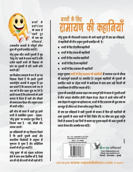 Ramayana is one of the most popular epics in the world, having been translated into various languages. It is a tale of Ram, the prince of Ayodhya, who was banished to the forest for 14 years. To honour his father's word, he agreed to be exiled without any murmur or rancour. In the forest, Ram, his wife Sita and his brother Lakshman met saints, new friends and strange foes. Each day brought new adventures. But their spartan, yet happy life was spoilt when Ravan of Lanka, the king of demons, abducted Sita. To rescue her, Ram enlisted the help of the vanar sena (monkey army) of Hanuman. In that battle many heroes died and new ones had come alive. The book Ramayana Tales for Children is a compilation of 40 one-page stories for children. Language used is plain and simple. Each story unfolds the way original epic proceeds. Long details have been dispensed with while retaining the essence that children can easily grasp. The stories come with realistic caricature based illustrations to retain interest of young readers. In this vividly told vibrant version for children, the ancient epic unfolds many unpredictable twists and turns. The traditional ingredients are all there - adventure and excitement, love and war and an infinite number of stories within stories, as are the traditional characters - monkeys, who cross a sea to lay floating bridge and also carry on their finger life-giving herbs found only on a mountain, besides shape-changing demons and monsters of many varieties. The epic has been rendered traditional and contemporary by the freshness and vitality of the author J.M.Mehta and exuberant illustrations that retain the interest of children till the last.