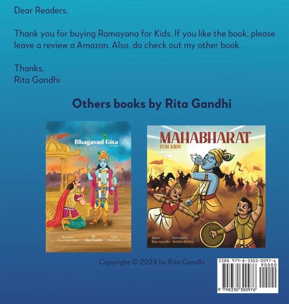 Ramayana is an Indian epic about Lord Rama and his wife Sita. Rama despite being the prince of Ayodhya lived in exile for 14 years to honor his father's words. Ramayana for Kids captures Rama's life and quest to rescue his beloved wife Sita from the clutches of Ravana with the help of Lakshmana and Hanuman. The book is a shortened version of Ramayana with eye-catching illustrations and high vocabulary. This is a perfect book to introduce kids aged 3-7 years to Indian mythology.