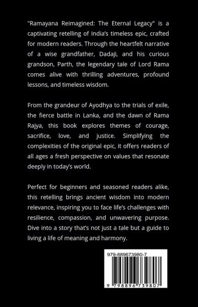 In Ramayana Reimagined: The Eternal Legacy, the timeless tale of Lord Rama unfolds with a fresh perspective, blending ancient wisdom with modern relevance. Through the warm and engaging storytelling of Dadaji to his curious grandson Parth, this retelling offers a vivid journey into one of the greatest epics of all time. The story begins in the prosperous kingdom of Ayodhya, where a hero is born to uphold dharma and lead by example. As Rama, Sita, and Lakshmana embark on an extraordinary journey into the wilderness, they encounter challenges that test their resilience, courage, and unwavering commitment to righteousness. From facing the cunning rakshasas to forging alliances with noble souls like Hanuman, the epic builds to the climactic battle against Ravana in the golden city of Lanka. Beyond the thrilling narrative lies a deeper exploration of universal values-sacrifice, loyalty, justice, and love-that resonate even today. Each chapter is crafted to transport readers to a world of wonder while reflecting on life's most profound truths. Perfect for beginners and seasoned admirers of the Ramayana, this book bridges generations, inviting readers to immerse themselves in its eternal legacy. Discover a story that's not just about gods and demons but about humanity's enduring quest for meaning, virtue, and harmony.