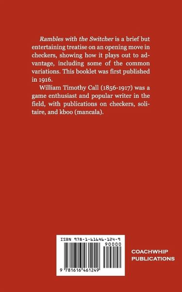 Rambles with the Switcher is a brief but entertaining treatise on an opening move in checkers, showing how it plays out to advantage, including some of the common variations. This booklet was first published in 1916. William Timothy Call (1856-1917) was a game enthusiast and popular writer in the field, with publications on checkers, solitaire, and kboo (mancala).