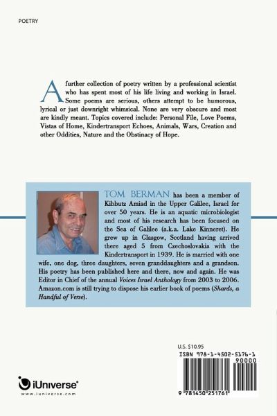 A further collection of poetry written by a professional scientist who has spent most of his life living and working in Israel. Some poems are serious, others attempt to be humorous, lyrical or just downright whimsical. None are very obscure and most are kindly meant. Topics covered include: Personal File, Love Poems, Vistas of Home, Kindertransport Echoes, Animals, Wars, Creation and other Oddities, Nature and the Obstinacy of Hope.