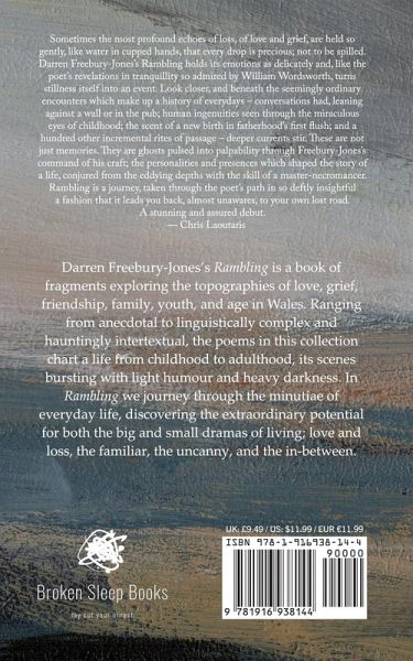 Darren Freebury-Jones's Rambling is a book of fragments exploring the topographies of love, grief, friendship, family, youth, and age in Wales. Ranging from anecdotal to linguistically complex and hauntingly intertextual, the poems in this collection chart a life from childhood to adulthood, its scenes bursting with light humour and heavy darkness. In Rambling we journey through the minutiae of everyday life, discovering the extraordinary potential for both the big and small dramas of living; love and loss, the familiar, the uncanny, and the in-between.
