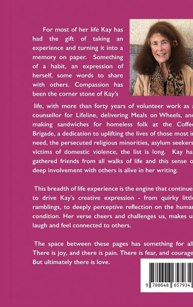 For most of her life Kay has had the gift of taking an experience and turning it into a memory on paper. Something of a habit, an expression of herself, some words to share with others. Compassion has been the cornerstone of Kay's life, with more than forty years of volunteer work as a counsellor for Lifeline, delivering Meals on Wheels, and making sandwiches for homeless folk at the Coffee Brigade, a dedication to uplifting the lives of those most in need, the persecuted religious minorities, asylum seekers, victims of domestic violence, the list is long. Kay has gathered friends from all walks of life and this sense of deep involvement with others is alive in her writing. This breadth of life experience is the engine that continues to drive Kay's creative expression - from quirky little ramblings, to deeply perceptive reflection on the human condition. Her verse cheers and challenges us, makes us laugh and feel connected to others. The space between these pages has something for all. There is joy, and there is pain. There is fear, and courage. But ultimately there is love. Kay also shares the struggles of her later years, seeking to find answers for Parkinson's disease. Writing to encourage herself and her readers, her words overflow with a positivity generated by gratefulness and a firm faith in divine goodness.