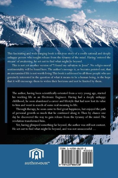 This fascinating and wide-ranging book is the true story of a coolly rational and deeply unhappy person who sought release from the tyranny of the mind. Having 'entered the stream' of awakening, he set out to find what might lie beyond. This is not yet another version of "I found my salvation in Jesus". No religio-moral sentimentality will be found here. The author's message is, as Socrates pointed out, that an unexamined life is not worth living. This book is addressed to all those people who are genuinely interested in the question of what it means to be a human being, in the hope that it will encourage them to widen their horizons and not be limited by them.