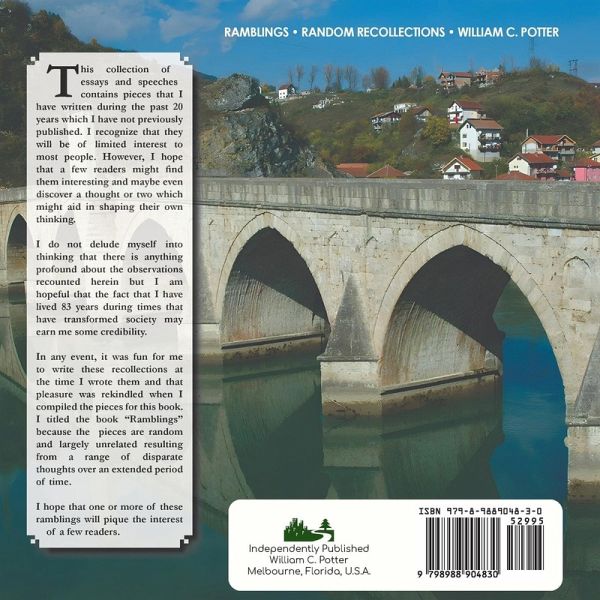 This short book contains a few pieces that I have written during the past 20 years which I have not previously published. I recognize that they will be of limited interest to most people. However, I hope that a few readers might find them interesting and maybe even discover a thought or two which might aid in shaping their own thinking. I do not delude myself into thinking that there is anything profound about the observations recounted herein but I am hopeful that the fact that I have lived 83 years during times that have transformed society may earn me some credibility. In any event, it was fun for me to write these recollections at the time I wrote them and that pleasure was rekindled when I compiled the pieces for this book.I titled the book "Ramblings" because the pieces are random and largely unrelated resulting from a range of disparate thoughts over an extended period of time. I hope that one or more of these ramblings will pique the interest of a few readers.