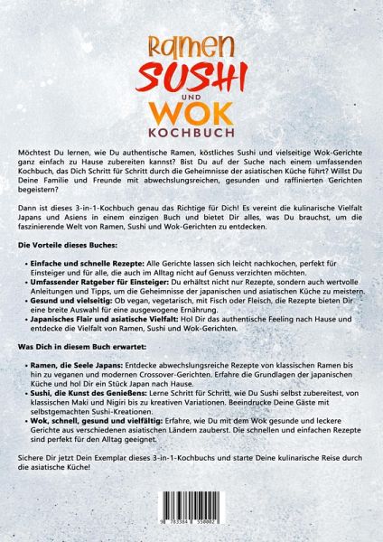 Möchtest Du lernen, wie Du authentische Ramen, köstliches Sushi und vielseitige Wok-Gerichte ganz einfach zu Hause zubereiten kannst? Bist Du auf der Suche nach einem umfassenden Kochbuch, das Dich Schritt für Schritt durch die Geheimnisse der asiatischen Küche führt? Willst Du Deine Familie und Freunde mit abwechslungsreichen, gesunden und raffinierten Gerichten begeistern?Dann ist dieses 3-in-1-Kochbuch genau das Richtige für Dich! Es vereint die kulinarische Vielfalt Japans und Asiens in einem einzigen Buch und bietet Dir alles, was Du brauchst, um die faszinierende Welt von Ramen, Sushi und Wok-Gerichten zu entdecken.Die Vorteile dieses Buches:- Einfache und schnelle Rezepte: Alle Gerichte lassen sich leicht nachkochen, perfekt für Einsteiger und für alle, die auch im Alltag nicht auf Genuss verzichten möchten.- Umfassender Ratgeber für Einsteiger: Du erhältst nicht nur Rezepte, sondern auch wertvolle Anleitungen und Tipps, um die Geheimnisse der japanischen und asiatischen Küche zu meistern.- Gesund und vielseitig: Ob vegan, vegetarisch, mit Fisch oder Fleisch, die Rezepte bieten Dir eine breite Auswahl für eine ausgewogene Ernährung.- Japanisches Flair und asiatische Vielfalt: Hol Dir das authentische Feeling nach Hause und entdecke die Vielfalt von Ramen, Sushi und Wok-Gerichten.Was Dich in diesem Buch erwartet:- Ramen, die Seele Japans: Entdecke abwechslungsreiche Rezepte von klassischen Ramen bis hin zu veganen und modernen Crossover-Gerichten. Erfahre die Grundlagen der japanischen Küche und hol Dir ein Stück Japan nach Hause.- Sushi, die Kunst des Genießens: Lerne Schritt für Schritt, wie Du Sushi selbst zubereitest, von klassischen Maki und Nigiri bis zu kreativen Variationen. Beeindrucke Deine Gäste mit selbstgemachten Sushi-Kreationen.- Wok, schnell, gesund und vielfältig: Erfahre, wie Du mit dem Wok gesunde und leckere Gerichte aus verschiedenen asiatischen Ländern zauberst. Die schnellen und einfachen Rezepte sind perfekt für den Alltag geeignet.Sichere Dir jetzt Dein Exemplar dieses 3-in-1-Kochbuchs und starte Deine kulinarische Reise durch die asiatische Küche!