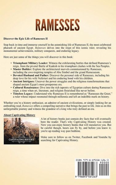 Discover the Epic Life of Ramesses II Step back in time and immerse yourself in the astonishing life of Ramesses II, the most celebrated pharaoh of ancient Egypt. Ramesses delves into the reign of this iconic ruler, revealing his monumental achievements, military conquests, and enduring legacy. Here are just some of the things you will discover in this book: ¿¿¿¿¿ Triumphant Military Leader: Witness the exhilarating battles that defined Ramesses's reign, from the pivotal Battle of Kadesh to his triumphant clashes with the Sea Peoples. ¿¿¿¿¿ Master Builder: Explore the architectural marvels commissioned by Ramesses, including the awe-inspiring temples of Abu Simbel and the grand Ramesseum. ¿¿¿¿ Devoted Husband and Father: Discover the personal side of Ramesses, including his deep love for his wife Nefertari and his enduring bond with his children. ¿¿¿¿¿¿¿¿ Ancient Intrigues: Uncover the power struggles and the religious transformations that shaped ancient Egypt's most prosperous era. ¿¿¿¿ Cultural Renaissance: Dive into the rich tapestry of Egyptian culture during Ramesses's reign, a time when art, literature, and religion flourished like never before. ¿¿¿¿ Timeless Legacy: Understand why Ramesses II is remembered as "Ramesses the Great," a ruler whose impact resonated through millennia and left an indelible mark on history. Whether you're a history enthusiast, an admirer of ancient civilizations, or simply looking for an enthralling read, Ramesses offers a compelling narrative that brings the past to life. Join us on this unforgettable journey and witness the grandeur of a king who truly defined an era.