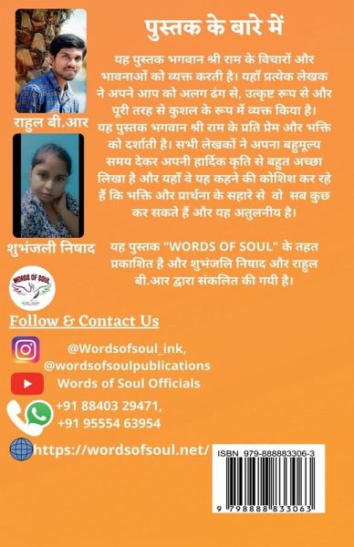 This book expresses the thoughts and feelings of Hindu God Rama. Here each and every writer has expressed themselves differently, excellently and skilled fully. This book upholds the love and devotion towards Lord Rama. All the writers have written extremely well with their hearty work by giving their valuable time and here they are trying to say that devotion and players can change anything and everything and it's incomparable. They have written the writeup from their heart core with happiest feelings and with true devotion. This book is published under "WORDS OF SOUL'' and compiled by Shubhanjali Nishad and Rahul.B.R.