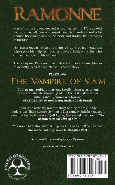 A year after he became embroiled in a seductive web of blood-letting, sexual excess, and mind-altering time shifting with a 175 year-old Vampire, Martin Larue returns to his adopted home of Bangkok a changed man. With his shaved head and orange robe, he is barely recognized by the doorman to his luxury apartment. For twelve months he had studied the Dharma of the great teacher Bhuddah. Learned the noble truths. Practiced the three fundamental principles - Not to do any evil. To cultivate good. To purify the mind. His transcendent nirvana is shattered by the appearance at his apartment of Police Lieutenant Samarat who seeks his help in tracking down a killer - a killer who drains the blood of his victims. In a cave on the shore of Cambodia, Ramonne, the vampire, has also been reborn. A local Shaman had procured just enough of his ashes from his fiery demise, to concoct a mystical potion that when injected into an infant bat, metamorphosed into an adult male vampire. When his transformation was complete he was taken from the cave by Kanchana, a wealthy young woman who is terrified of a ravenous disease that has progressed through all female members of her family. The evolving vampire offers her the only chance for salvation - the gift of eternal life. Ramonne complies and for awhile there are a pair of vampires stalking the shadows of Bangkok. ¿¿¿¿¿¿¿Martin is reunited with Areeyah, the sultry daughter of his and Ramonne's former nemesis Boonsong, and through their common suffering a romance is born. They join the new Police Lieutenant to help find what Martin prays is not a vampire. However Martin soon learns the truth.