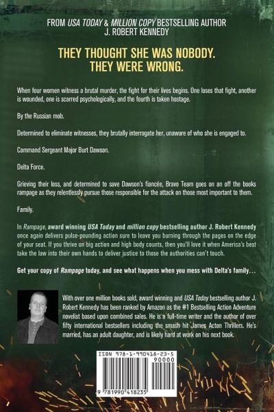 "One of the best writers today." (Johnny Olsen) / "A master storyteller." (Betty Richard) *** FROM USA TODAY & MILLION COPY BESTSELLING AUTHOR J. ROBERT KENNEDY *** THEY THOUGHT SHE WAS NOBODY. THEY WERE WRONG. When four women witness a brutal murder, the fight for their lives begins. One loses that fight, another is wounded, one is scarred psychologically, and the fourth is taken hostage. By the Russian mob. Determined to eliminate witnesses, they brutally interrogate her, unaware of who she is engaged to. Command Sergeant Major Burt Dawson. Delta Force. Grieving their loss, and determined to save Dawson's fiancée, Bravo Team goes on an off the books rampage as they relentlessly pursue those responsible for the attack on those most important to them. Family. In Rampage, award winning USA Today and million copy bestselling author J. Robert Kennedy once again delivers pulse-pounding action sure to leave you burning through the pages on the edge of your seat. If you thrive on big action and high body counts, then you'll love it when America's best take the law into their own hands to deliver justice to those the authorities can't touch. Get your copy of Rampage today, and see what happens when you mess with Delta's family...