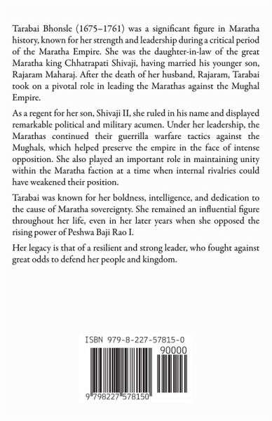 Tarabai Bhonsle (1675-1761) was a significant figure in Maratha history, known for her strength and leadership during a critical period of the Maratha Empire. She was the daughter-in-law of the great Maratha king Chhatrapati Shivaji, having married his younger son, Rajaram Maharaj. After the death of her husband, Rajaram, Tarabai took on a pivotal role in leading the Marathas against the Mughal Empire. As a regent for her son, Shivaji II, she ruled in his name and displayed remarkable political and military acumen. Under her leadership, the Marathas continued their guerrilla warfare tactics against the Mughals, which helped preserve the empire in the face of intense opposition. She also played an important role in maintaining unity within the Maratha faction at a time when internal rivalries could have weakened their position. Tarabai was known for her boldness, intelligence, and dedication to the cause of Maratha sovereignty. She remained an influential figure throughout her life, even in her later years when she opposed the rising power of Peshwa Baji Rao I. Her legacy is that of a resilient and strong leader, who fought against great odds to defend her people and kingdom.