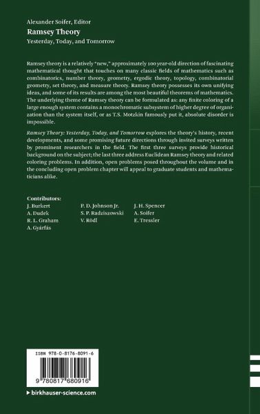 Ramsey theory is a relatively "new," approximately 100 year-old direction of fascinating mathematical thought that touches on many classic fields of mathematics such as combinatorics, number theory, geometry, ergodic theory, topology, combinatorial geometry, set theory, and measure theory. Ramsey theory possesses its own unifying ideas, and some of its results are among the most beautiful theorems of mathematics. The underlying theme of Ramsey theory can be formulated as: any finite coloring of a large enough system contains a monochromatic subsystem of higher degree of organization than the system itself, or as T.S. Motzkin famously put it, absolute disorder is impossible.Ramsey Theory: Yesterday, Today, and Tomorrow explores the theory's history, recent developments, and some promising future directions through invited surveys written by prominent researchers in the field. The first three surveys provide historical background on the subject; the last three address Euclidean Ramsey theory and related coloring problems. In addition, open problems posed throughout the volume and in the concluding open problem chapter will appeal to graduate students and mathematicians alike.