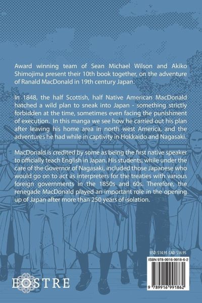 Award winning team of Sean Michael Wilson and Akiko Shimojima present their 10th book together, on the adventure of Ranald MacDonald in 19th century Japan. In 1848, the half Scottish, half Native American MacDonald hatched a wild plan to sneak into Japan - something strictly forbidden at the time, sometimes even facing the punishment of execution. In this manga we see how he carried out his plan after leaving his home area in north west America, and the adventures he had while in captivity in Hokkaido and Nagasaki. MacDonald is credited by some as being the first native speaker to officially teach English in Japan. His students, while under the care of the Governor of Nagasaki, included those Japanese who would go on to act as interpreters for the treaties with various foreign governments in the 1850s and 60s. Therefore, the renegade MacDonald played an important role in the opening up of Japan after more than 250 years of isolation.