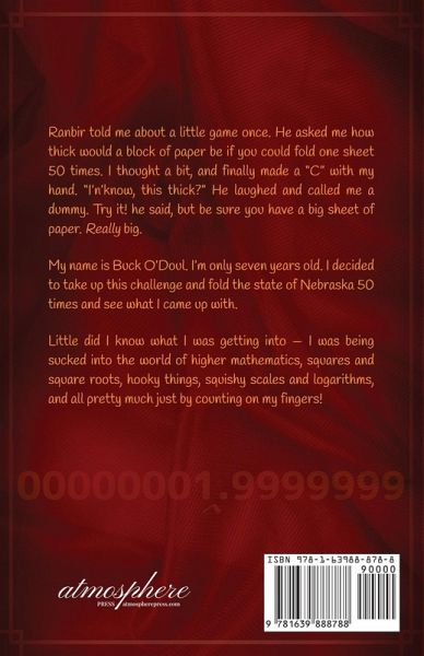 Ranbir told me about a little game once. He asked me how thick would a block of paper be if you could fold one sheet 50 times. I thought a bit and finally made a "C" with my hand. "I'n'know, this thick?" He laughed and called me a dummy. Try it! he said, but be sure you have a big sheet of paper. Really big. My name is Buck O'Doul. I'm only seven years old. I decided to take up this challenge and fold the state of Nebraska 50 times and see what I came up with. Little did I know what I was getting into -- I was being sucked into the world of higher mathematics, squares and square roots, hooky things, squishy scales and logarithms, and all pretty much just by counting on my fingers!