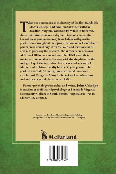 This book summarizes the history of the first Randolph Macon College, and how it intertwined with the Boydton, Virginia, community. While in Boydton, almost 300 students took a degree. This book tracks the lives of these graduates, many from before college, after graduation, throughout their participation in the Confederate government or military, after the War, and for many, until death. In pursuing the research, the author came across an additional 100 men who had attended RMC, and their stories are included as well, along with the chaplains for the college chapel, the tutors for the college students and all adjunct and full-time faculty for the 38 year period. The graduates include 52 college presidents and numerous members of Congress. Many leaders of society, education and politics began their careers at RMC.