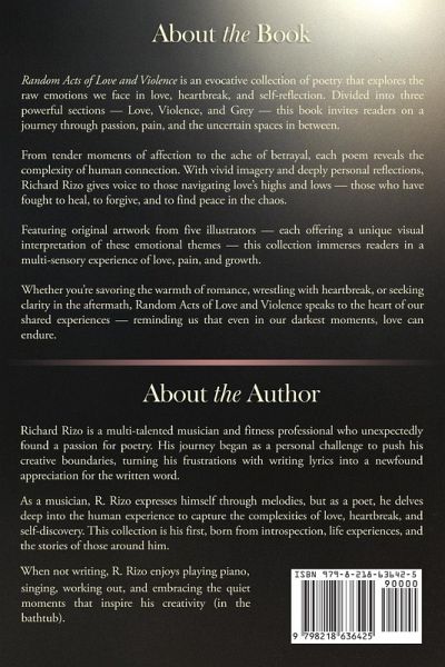 Random Acts of Love and Violence is a bold and emotionally charged poetry collection that explores the beauty, brutality, and uncertainty of love. Divided into three powerful sections-Love, Violence, and Grey-this book guides readers through raw vulnerability, heartbreak, and healing. With vivid language and deeply personal insight, Richard Rizo invites you into a world where passion and pain coexist, and where the journey through emotion becomes art. Featuring original artwork from five illustrators around the world , this debut collection is both a literary and visual experience-poetry that doesn't just speak, but resonates.
