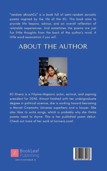 "random aKrostiCs" is a book full of semi-random acrostic poems inspired by the life of the KC. This book aims to provide life lessons, advice, and an overall reflection of relatable experiences. And sometimes the poems are just fun little thoughts from the back of the author's mind. A little word association if you will