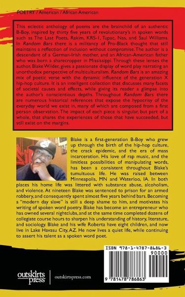 This eclectic anthology of poems are the brainchild of an authentic B-Boy, inspired by thirty five years of revolutionary's in spoken words such as The Last Poets, Rakim, KRS-1, Tupac, Nas, and Saul Williams. In Random Bars there is a militancy of Pro-Black thought that still maintains a reflection of inclusion without compromise. The author is a descendant of a German-Irish mother, and an African-American father who was born a sharecropper in Mississippi. Through these lenses the author, Blake Wilder, gives a passionate display of word play narrating an unorthodox perspective of multiculturalism. Random Bars is an amazing mix of poetic verse with the dynamic influence of the generation X hip-hop culture. It is an intelligent collection that discusses many facets of societal causes and effects, while giving its reader a glimpse into the author's conscientious depths. Throughout Random Bars there are numerous historical references that expose the hypocrisy of the everyday world we exist in, many of which are composed from a first person observation. The impact of each piece is singular, but part of a whole, that shares the experiences of those that have succeeded, but still exist on the margins.